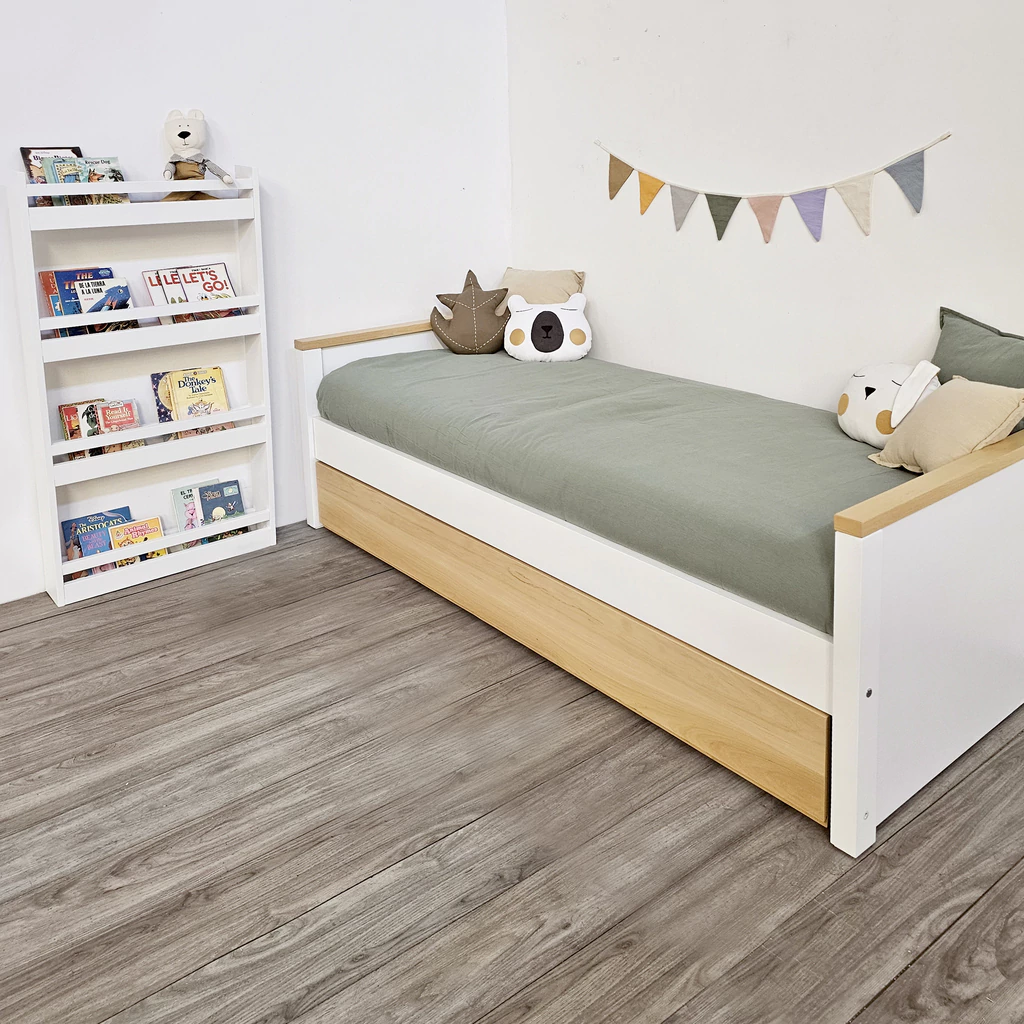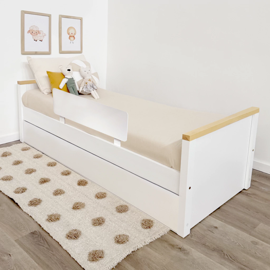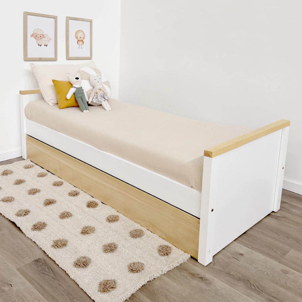 El Diván Chipi Evolutiva con Cama Carrito está fabricado en MDF de doble placa, lo que garantiza durabilidad y resistencia. Su acabado es laqueado atóxico. Soporta hasta 110kg.-