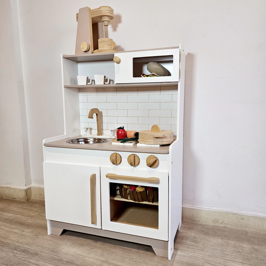 Esta encantadora cocina de juguete está fabricada en Mdf pintada con hidroesmalte al agua, garantizando un producto libre de tóxicos. Todas sus perillas son móviles y cuenta con horno, microondas, hornalla, bacha y bajo mesada. Ideal para estimular la imaginación y el juego simbólico, esta cocina es un regalo perfecto para los pequeños chefs en casa