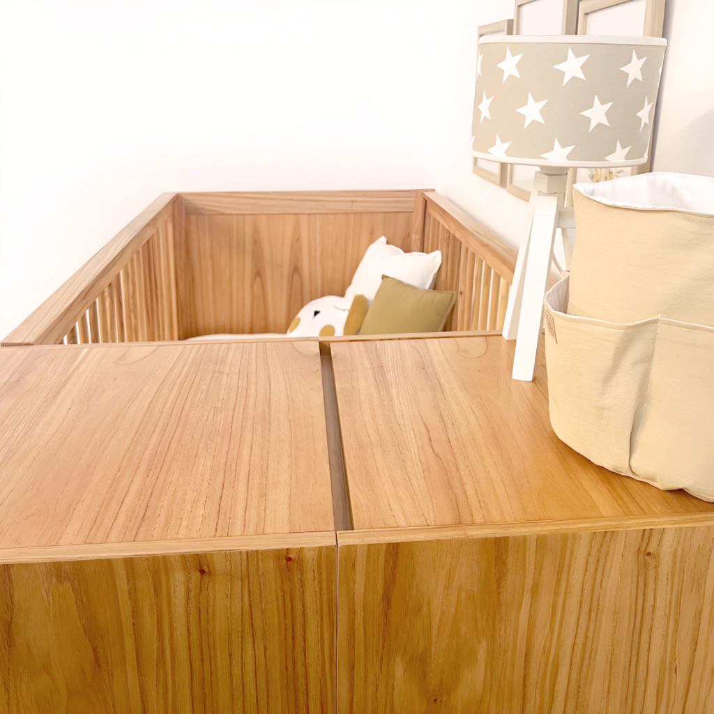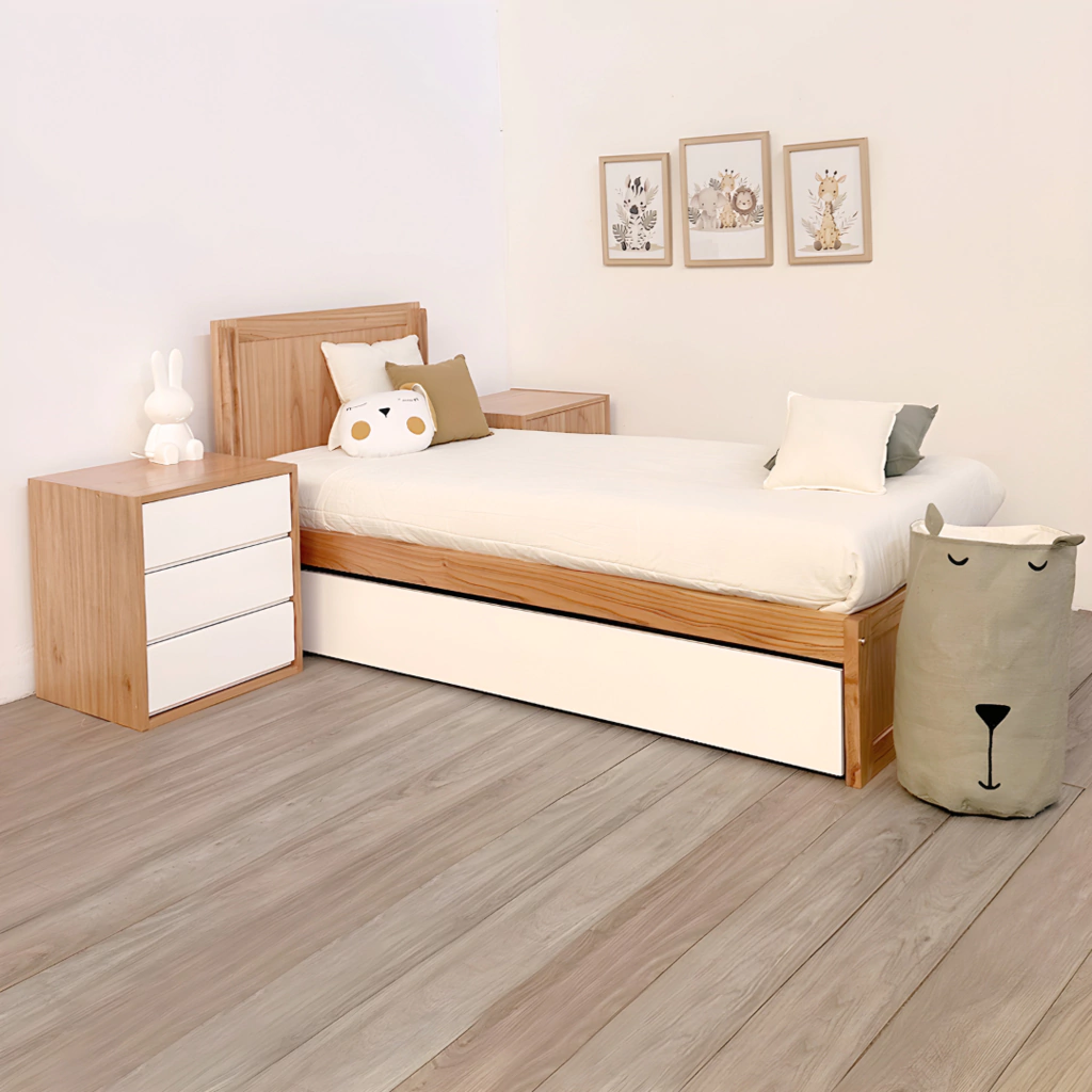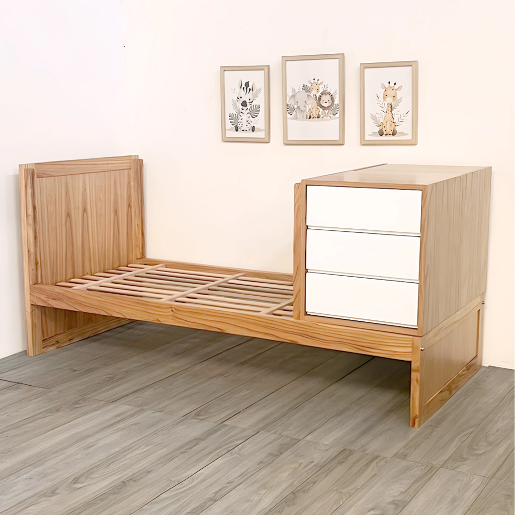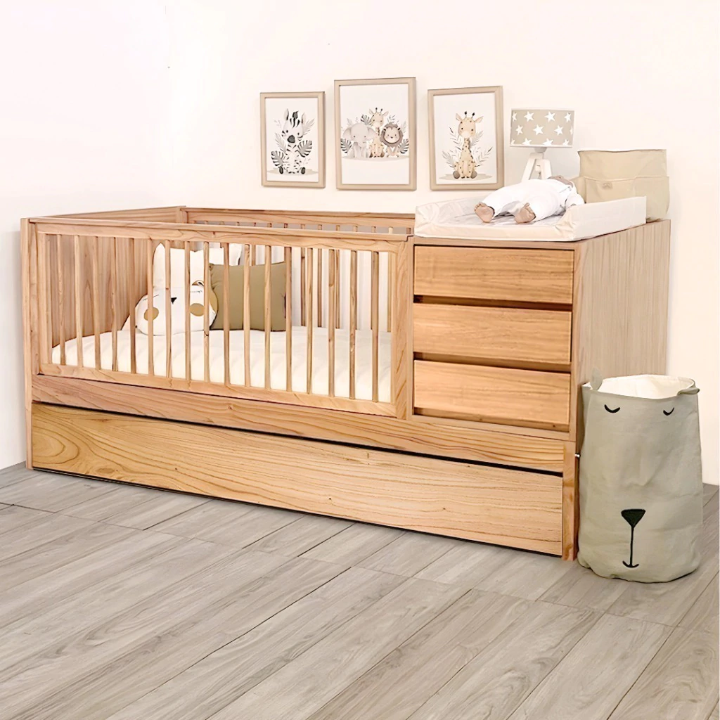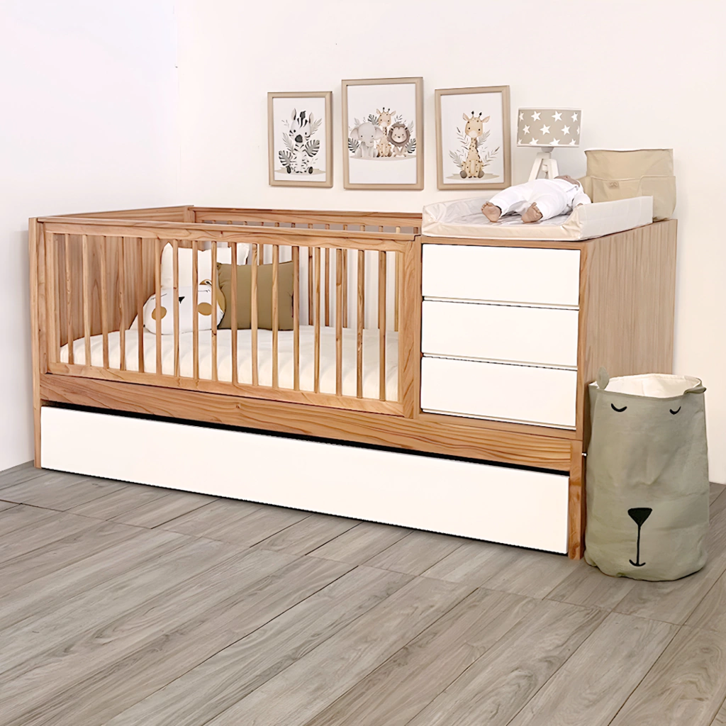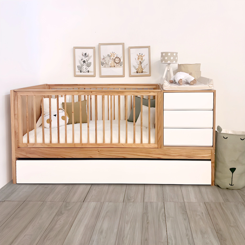 Las cunas funcionales están diseñadas para acompañar todo el crecimiento del bebé. Estas cunas se transforman fácilmente en una cama de una plaza, acompañadas de una mesa de luz (con 3 cajones) y un baúl juguetero. Las barandas tienen una altura de 60 cm y cuentan con un sistema deslizable hacia arriba. Los cajones están equipados con guías telescópicas, y un uñero como sistema de apertura. Fabricada en madera Paraíso, brindando firmeza y seguridad. Los frentes de cajones y frente de carrito blanco están hechos de Mdf laqueado atóxico en blanco. Cuenta con una laca de protección poliuretanica, asegurando durabilidad y un acabado impecable. La cama carrito es fija y permite incorporar una persona más. Soporta hasta 110 kg.