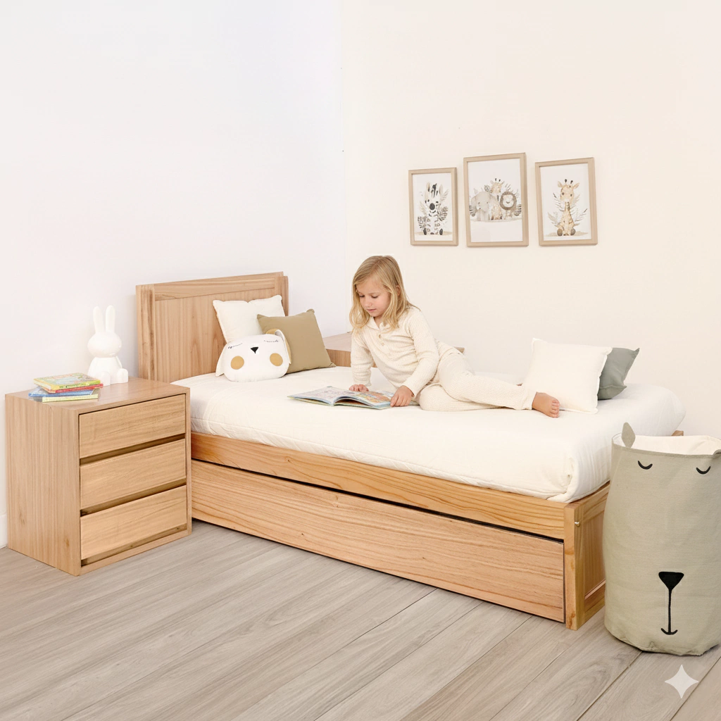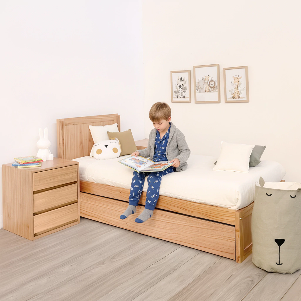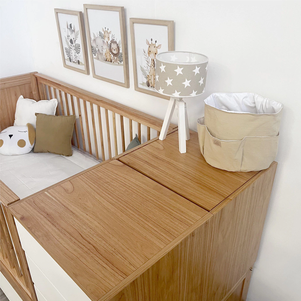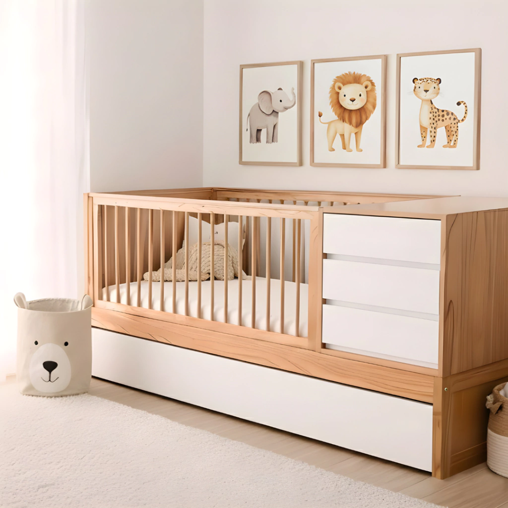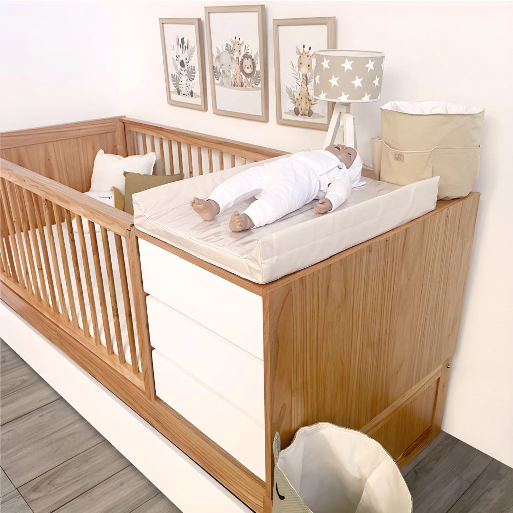 Las cunas funcionales están diseñadas para acompañar todo el crecimiento del bebé. Estas cunas se transforman fácilmente en una cama de una plaza, acompañadas de una mesa de luz (con 3 cajones) y un baúl juguetero. Las barandas tienen una altura de 60 cm y cuentan con un sistema deslizable hacia arriba. Los cajones están equipados con guías telescópicas, y un uñero como sistema de apertura. Fabricada en madera Paraíso, brindando firmeza y seguridad. Los frentes de cajones y frente de carrito blanco están hechos de Mdf laqueado atóxico en blanco. Cuenta con una laca de protección poliuretanica, asegurando durabilidad y un acabado impecable. La cama carrito es fija y permite incorporar una persona más. Soporta hasta 110 kg.
