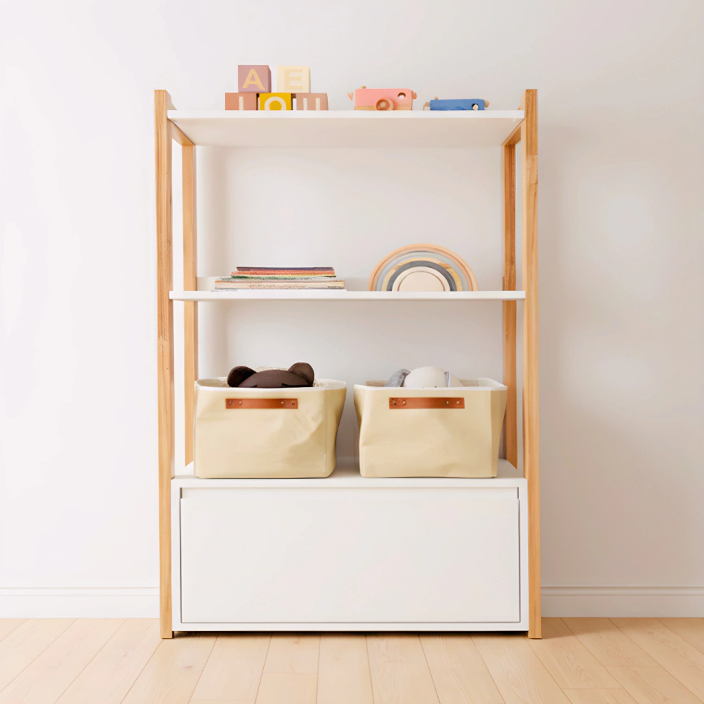 Nuestra biblioteca juguetero es el mueble ideal para mantener el orden en el cuarto de los pequeños. Con dos estantes y un cajón amplio equipado con guías telescópicas y sistema uñero para una apertura fácil, es súper resistente y práctico. Fabricada en madera Paraíso combinada con laca blanca