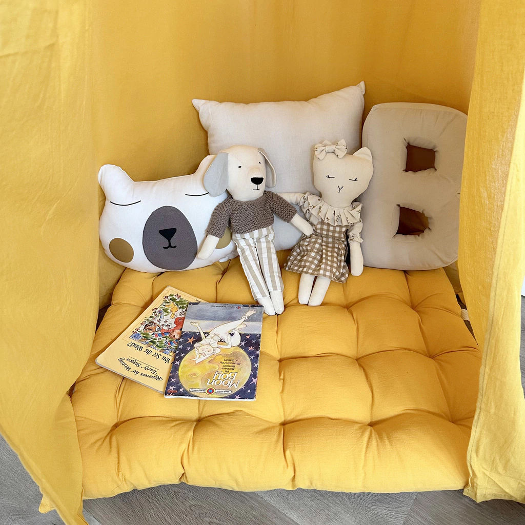 Incluye: - Un dosel.- Un almohadón de piso que invita al relax. - Un almohadón cuadrado de tusor de 30x30 cm, perfecto para sofás o sillas. - Un almohadón cuadrado de tusor de 40x40 cm, que aporta confort y estilo. - Un almohadón de letra fabricado en pana, personalizable a tu elección.