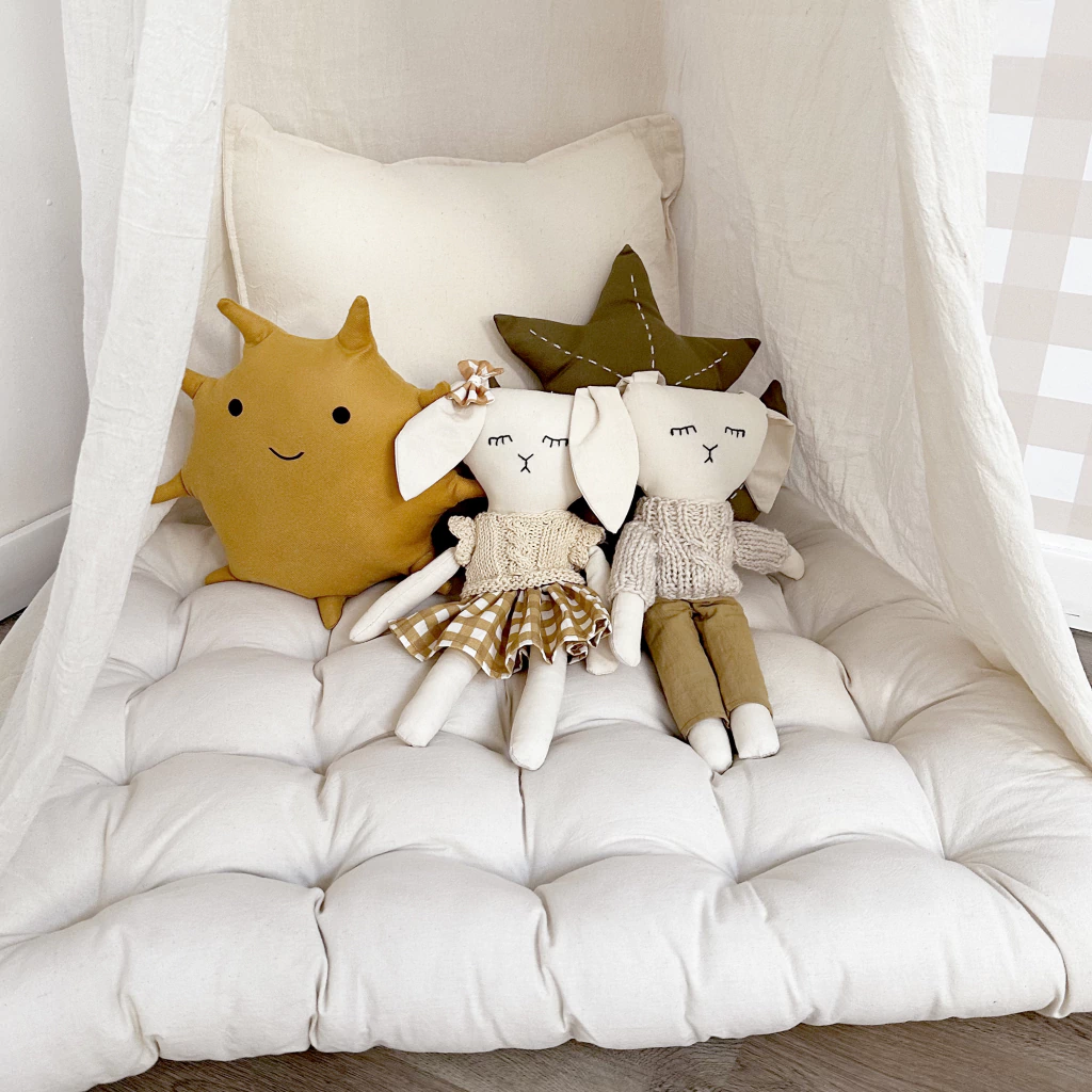 Incluye: - Un dosel.- Un almohadón de piso que invita al relax. - Un almohadón cuadrado de tusor de 30x30 cm, perfecto para sofás o sillas. - Un almohadón cuadrado de tusor de 40x40 cm, que aporta confort y estilo. - Un almohadón de letra fabricado en pana, personalizable a tu elección.